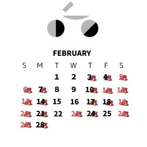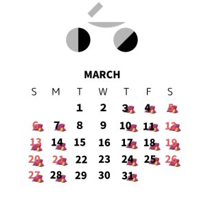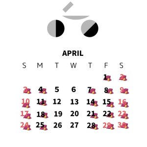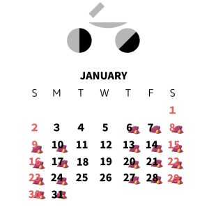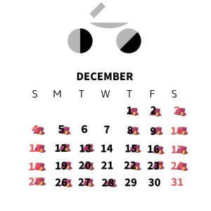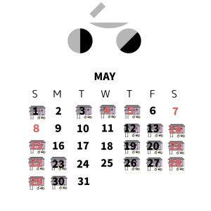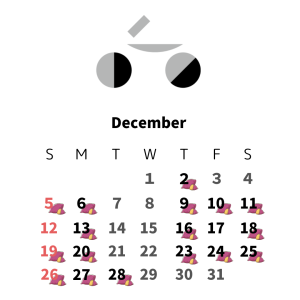 カレンダーのKuru,ru./大野バイシクルベース建物のマークがついた日がOPENしております。